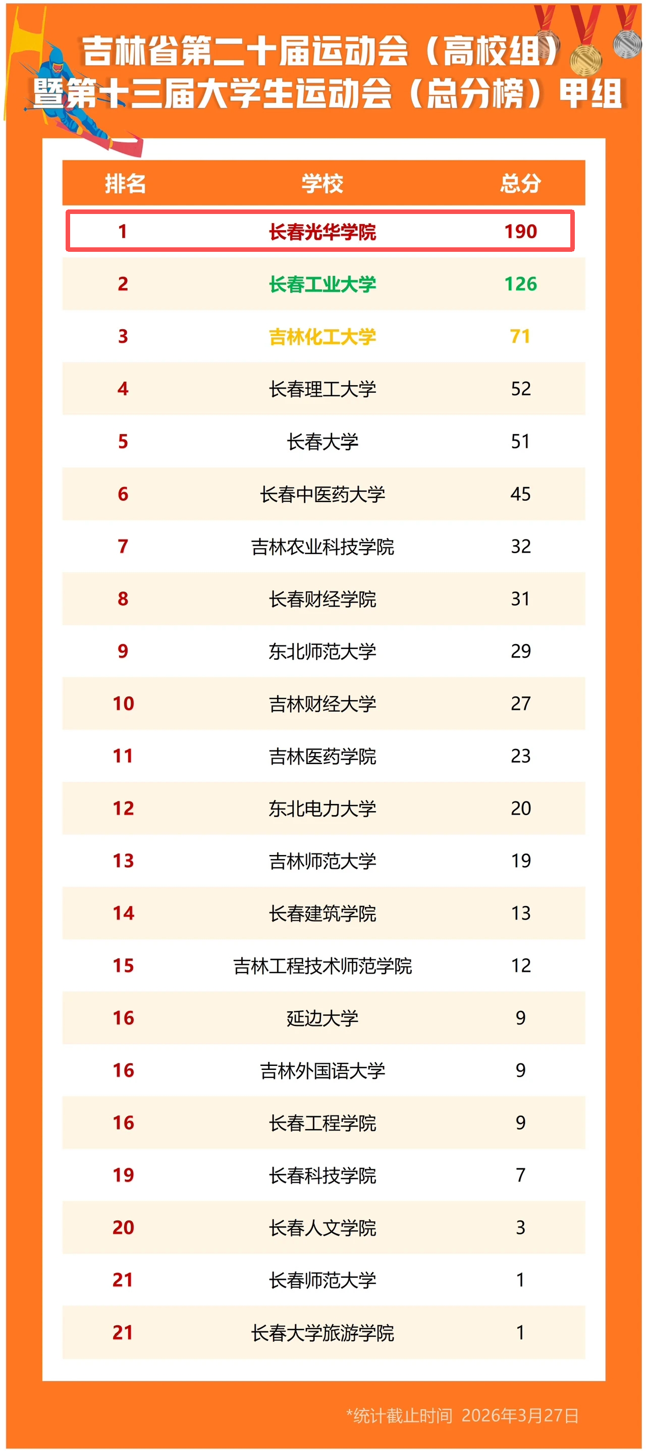 近日,吉林省第二十届运动会(高校组)暨第十三届大学生运动会赛事激战正酣。截至目前,我校代表团在甲组赛事中表现卓越,奖牌榜、总分榜均暂列全省第一,以昂扬姿态展现了光华学子的体育风采与拼搏精神,也为长春筹备2027年第33届世界大学生冬季运动会凝聚了青春力量、展现了高校担当。
