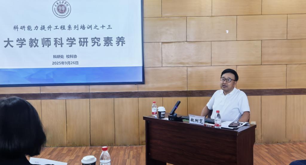为持续强化教师科研能力建设,夯实学校科研工作根基,助力高素质师资队伍培育,9月26日,我校科研能力提升工程系列培训第十三期顺利举办。本次培训以“大学教师科学研究素养”为核心主题,特邀吉林大学管理学院原院长赵树宽教授作专题分享,全校各教学单位教师参与学习。科研处处长张晓瑞主持。
