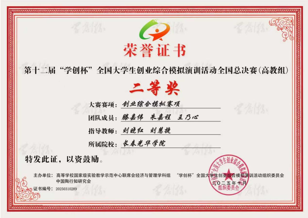 近日,第十二届“学创杯”全国大学生创业综合模拟演训活动总决赛(高教组)在成都理工大学圆满收官。我校参赛学生团队凭借扎实的专业素养与出色的实践能力,斩获全国总决赛二等奖1项;创新创业学院刘晓红、刘慧捷两位教师因指导成效显著,获评“优秀指导教师”称号。